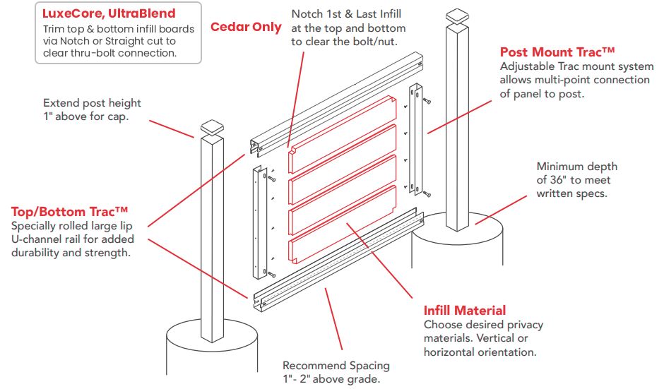 Material and finish options allow architects to customize the FenceTrac system to their design goals. LuxeCore composite boards measure 1″ x 5.875″ and are available in 6-foot lengths, with color options including Black Onyx, Harbor Gray, Timber Brown, and Tropical Teak. UltraBlend PVC infill shares the same dimensions and comes in finishes such as Aged Cedar, Natural Cedar, Chestnut Brown, and Redwood. For natural wood, Western Red Cedar is offered at 0.875″ x 5.5″ in lengths of 6 or 8 feet, but installation requires notching the first and last boards (between 1-1/2″ x 1-1/2″ and 3″ x 3″) to clear bolt connections during assembly. For fire-rated applications, 6063-T5 aluminum infill meets ASTM E84-24 Class A standards.